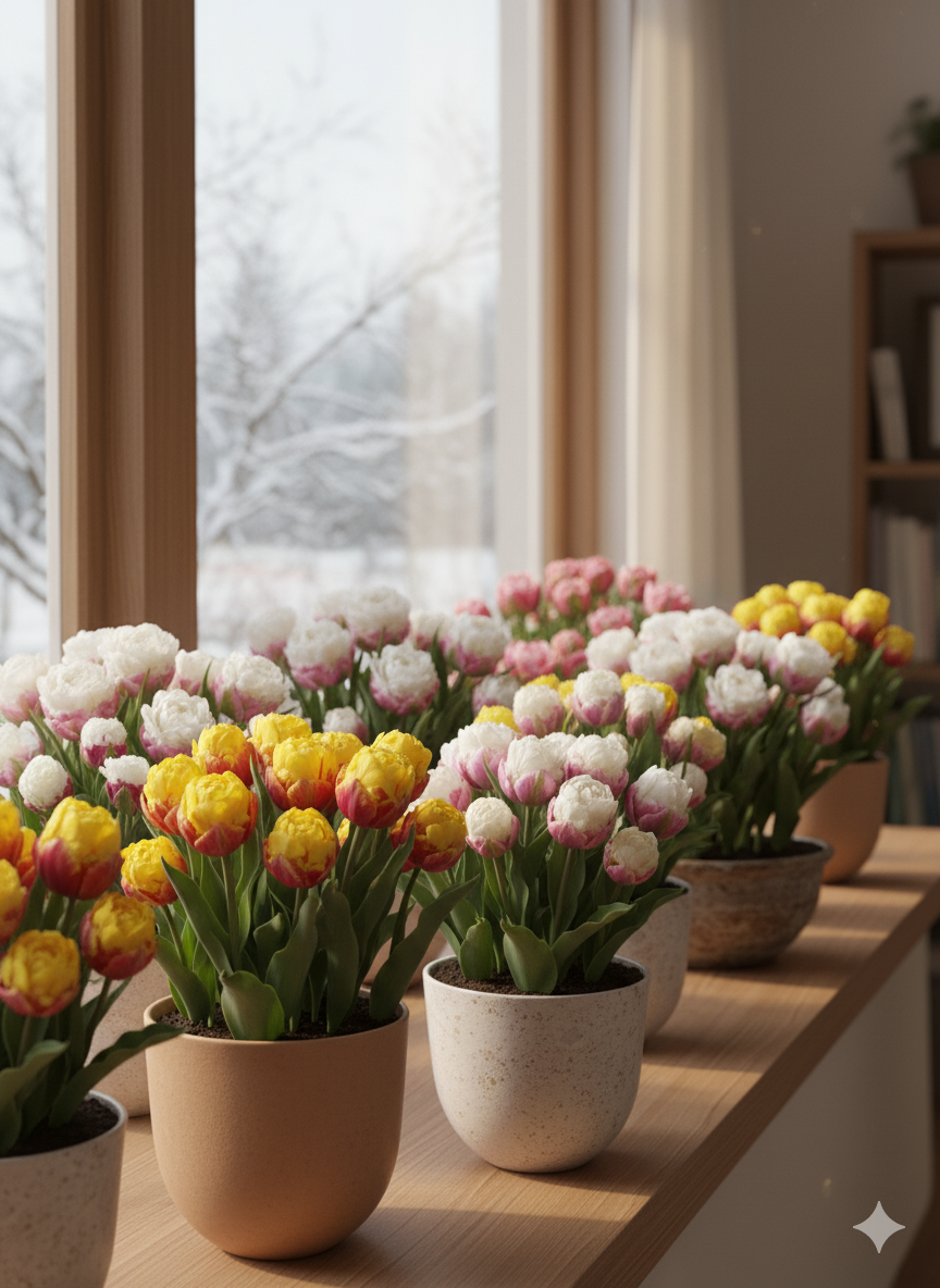 Додаткового зимового укриття кімнатні тюльпани не потребують — достатньо стабільної температури в приміщенні та легкого догляду.