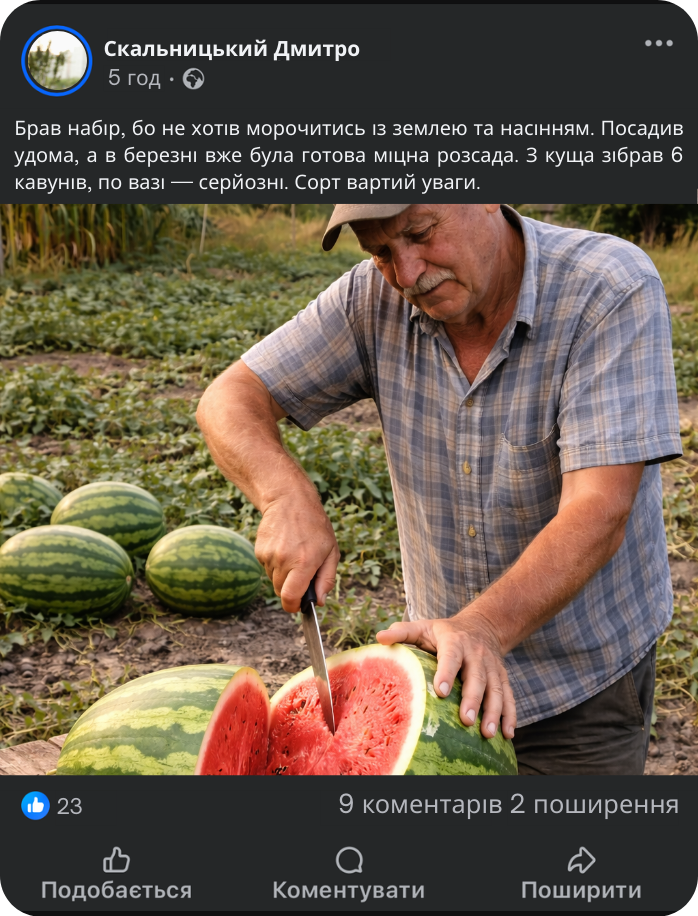 Кавуни виростають до 25 кг — це той випадок, коли результат видно одразу, без дрібноти й розчарувань.
